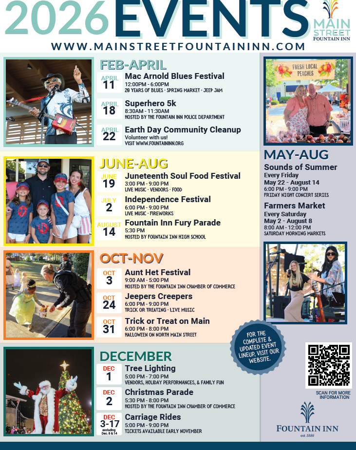 With Spring finally in town, and Summer on its way, event season in Fountain Inn is getting started this month with our annual Mac Arnold Cornbread & Collard Greens Blues Festival. This month I.....Read More